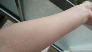 先日その番組の中で、アレルギー体質かどうかが簡単にわかるテストを取り上げていました。まず左腕の内側を出し、シャープペンシルを芯が出ていない状態にして、腕にすーっと線を書きます。その後、線をひいたところに何も反応がなければアレルギー体質ではなく、みみず腫れのように赤い跡が浮かび上がったらアレルギー体質であるといった具合です。
